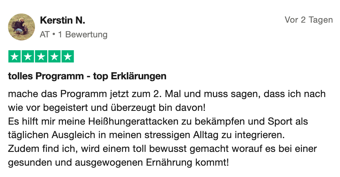 „Absolut auf Erfolg ausgerichtet. Durch das Prgramm bekam ich wieder viel mehr Gefühl und eine bessere Wahrnehmung für das Essen und Lebensmittel. Funktioniert!„